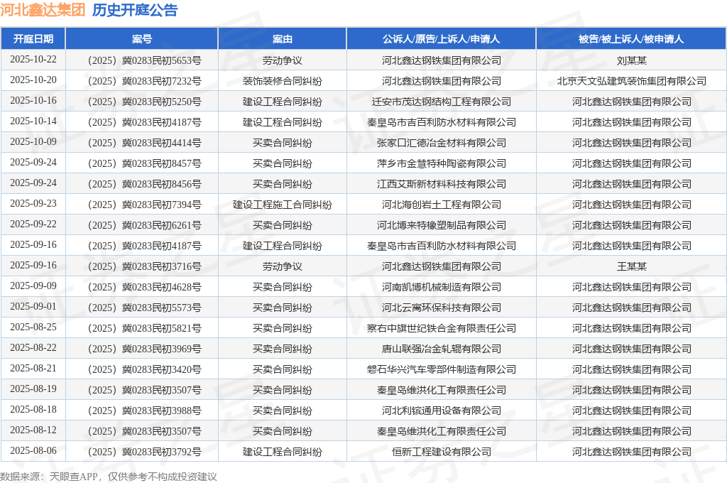 根据统计◈✿,近一年内以河北鑫达钢铁集团有限公司为当事人的历史开庭公告有126则◈✿,其中案由为“买卖合同纠纷”的公告以63则居首◈✿,其次为“劳动争议”有29则◈✿,“建设工程合同纠纷”有9则◈✿。历史开庭公告(前20条)如下◈✿:
